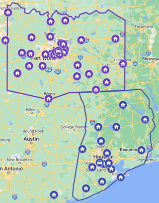 Families to Freedom provides private charitable flights for victims and new survivors calling from North Texas (purple box) or the upper Gulf Coast region (blue area). We are unable to accommodate departures that start from outside of the service areas. For travel, to a family home, it must be located outside of the service area you leave from. Transportation that stays inside of a box, will likely be honored by car/van ride. See our Ride to Safety page for information.